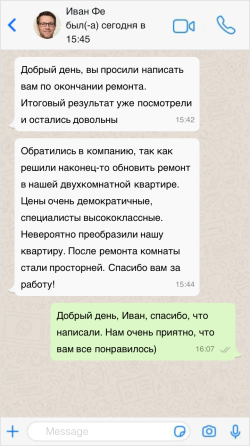 Окончательную стоимость ремонта можно узнать у менеджера фирмы по телефону после обсуждения деталей ремонта и выезда замерщика на объект.